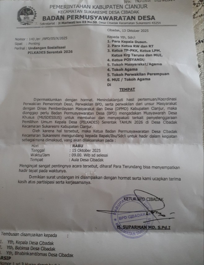 Musdessus tersebut akan digelar pada Rabu, 15 Oktober 2025, pukul 09.00 WIB di Aula Desa Cibadak, sebagaimana tertuang dalam surat resmi BPD bernomor 140/OT/BPD/05/X/2025.