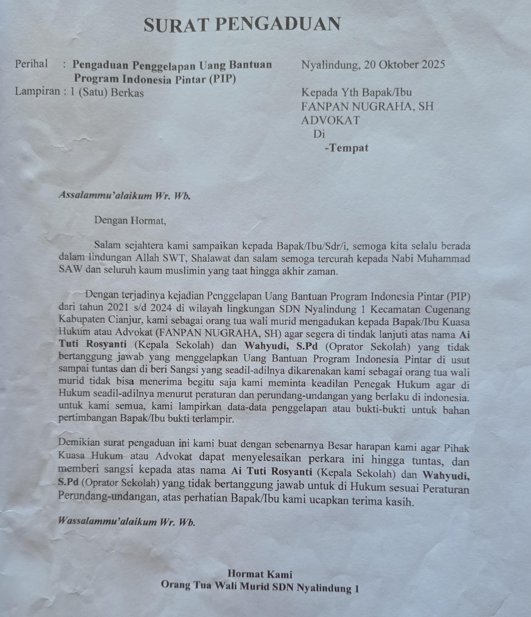 CIANJUR | INICIANJUR.COM – Belasan orang tua siswa SDN Nyalindung 1, Kecamatan Cugenang, Kabupaten Cianjur, mendatangi Kantor Pengacara Fanpan Nugraha di kawasan Nagrak, Senin (3/11/2025).